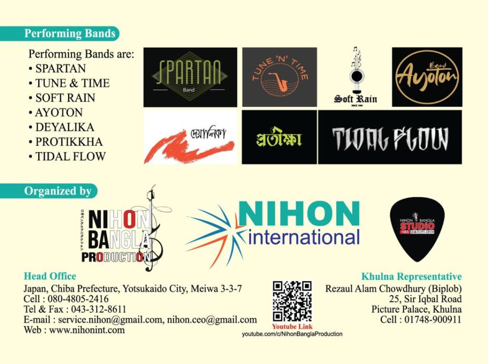 গুটি গুটি পায়ে নিহন বাংলা আপনাদের সহযোগীতায় এগিয়ে চলেছে। জাপান এবং বাংলাদেশ এই দুই দেশে আমরা নিয়মিত সংগীত নিয়ে মৌলিক কাজ করে চলেছি আমাদের সামর্থ মতো। এছাড়া সংগীত এবং সাংস্কৃতিক বিষয়ক নানা রকম কার্যক্রমের সাথে আমরা জড়িত রয়েছি নিয়মিত ভাবে। সেই ধারাবাহিকতায় বাংলাদেশে এবং জাপানে দুটি কনসার্টের আয়োজন করেছি আমরা। ১০ সেপ্টেম্বর শনিবার ৭টি ব্যান্ড…